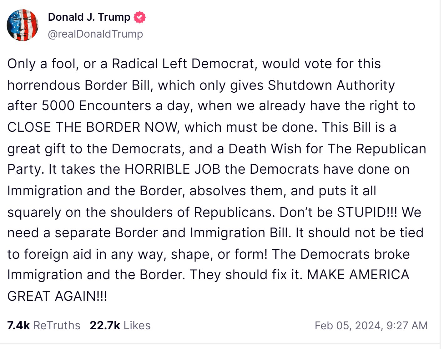 Колишній президент США Дональд Трамп жорстко розкритикував законопроєкт щодо змін у прикордонному законодавстві та військової допомоги Україні та Ізраїлю, який збираються виносити на голосування у Сенаті 7 лютого. Він заявив, що законопроєкт «не повинен бути пов’язаний з іноземною допомогою в будь-якому вигляді чи формі».