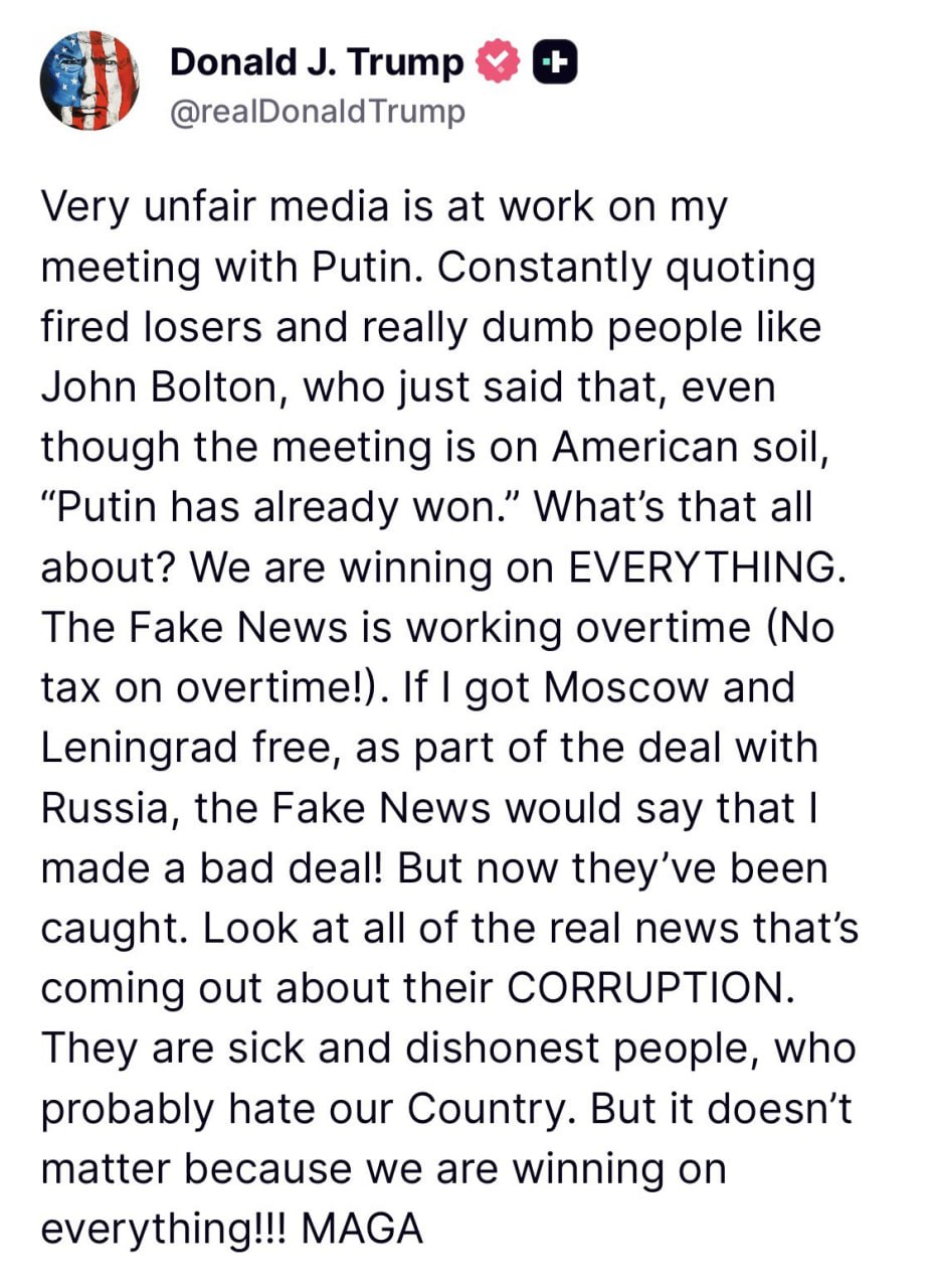 «Дуже несправедливі ЗМІ працюють над моєю зустріччю з Путіним. Постійно цитують звільнених невдах і справді дурних людей, таких як Джон Болтон, який щойно сказав, що, незважаючи на те, що зустріч відбувається на американській землі, «Путін уже переміг». Що це взагалі означає? Ми перемагаємо у всьому», - написав Трамп, підкресливши останнє слово.