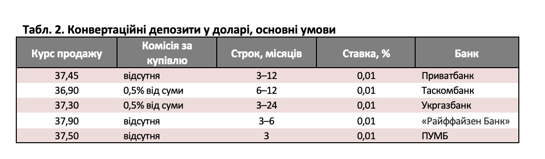 Депозити у валюті взагалі не привабливі з погляду відсотків, напевно, найбільш цікавими наразі є так звані конвертаційні депозити, які передбачають обмін гривні у валюту в момент оформлення вкладу. При поверненні вкладу на руки клієнт уже отримає долар чи євро. Такі вклади фактично дають можливість обміняти гривні на валюту за більш вигідним, ніж в обмінниках, курсом, у цьому, власне, й вигода. Відповідно, якщо за той час, поки гроші були на депозиті, обмінний курс зміниться, ви нічого не втратите (див. табл. 2). Утім, існує обмеження — оформити такий депозит можна на суму не більш як 100 тис. грн на місяць.