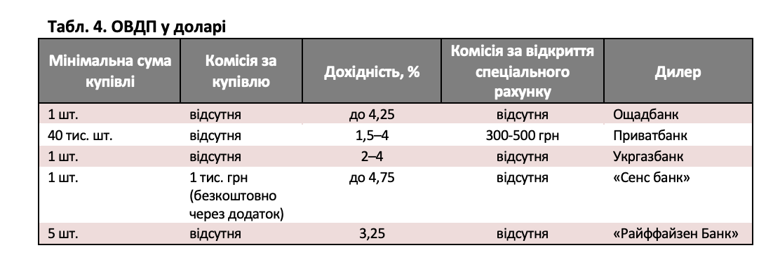 Їхня дохідність наразі в рази більша за поточні ставки за валютними депозитами, часом перевищуючи 4% річних (див. табл. 4). Усі інші переваги ті ж самі, що й у гривневих облігацій. Але варто пам'ятати про порівняно високий поріг входу, адже вартість однієї облігації становить уже тисячу доларів чи євро. Єдиний мінус валютних ОВДП — їхній дефіцит, оскільки зазвичай первинні дилери купують такі цінні папери для себе, а не на перепродаж, фізичним же особам доведеться докласти зусиль, аби скористатися цією інвестиційною можливістю. Та й додаток «Дія» тут не зарадить — там продають тільки гривневі ОВДП. Відповідно, сам процес є дещо складнішим: потрібно прийти у банк чи до брокера, укласти договір, відкрити спеціальний рахунок у цінних паперах, а часом і сплатити комісійні.