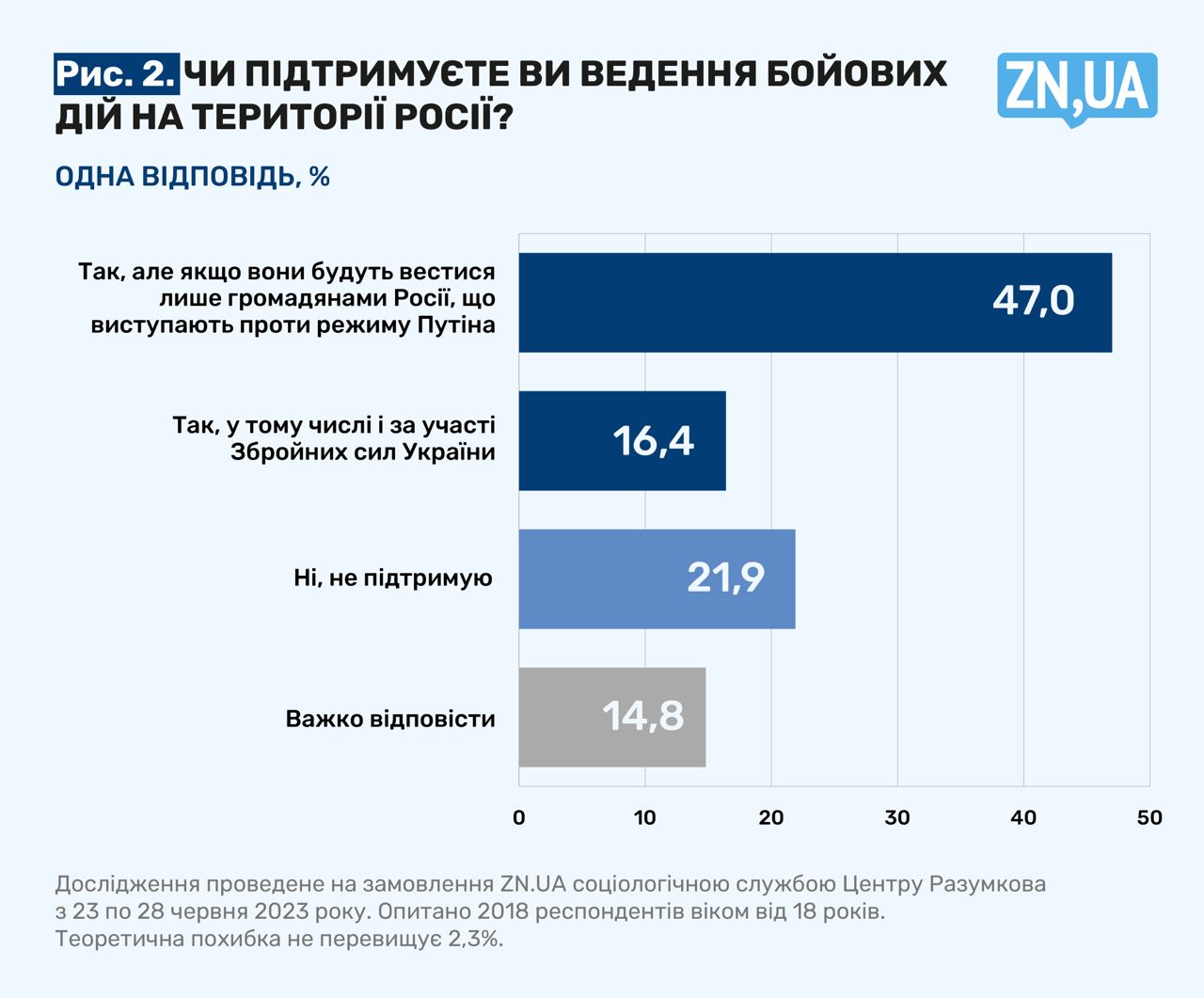 63,4% українців підтримують ведення бойових дій на території Росії, проте лише 16,4% при цьому допускають участь у них Збройних сил України, свідчать результати опитування, проведеного Центром Разумкова на замовлення ZN.UA, які опубліковані у статті Тетяни Силіної «Україну готують до переговорів з Росією? Що про це думають українці».