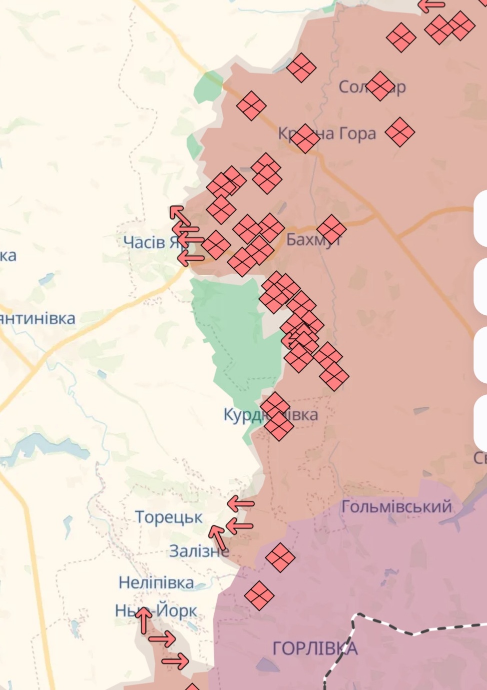 "Під Часовим Яром працює ворожа десантура, а під Торецьком — російські морпіхи... Річ у тому, що в деяких місцях війська РФ не змогли вийти до каналу, до тих меж, на які планували. Там залишилися наші позиції, хлопці тримаються", - додав він.