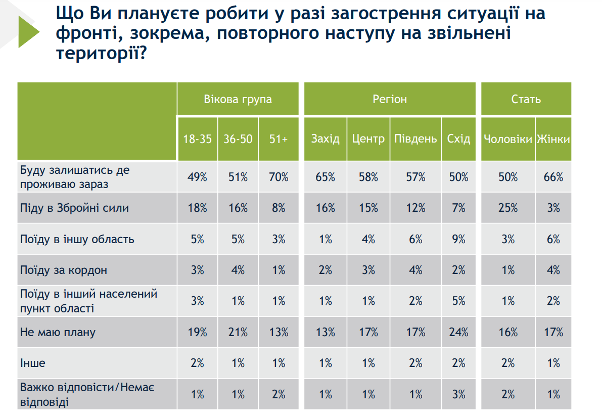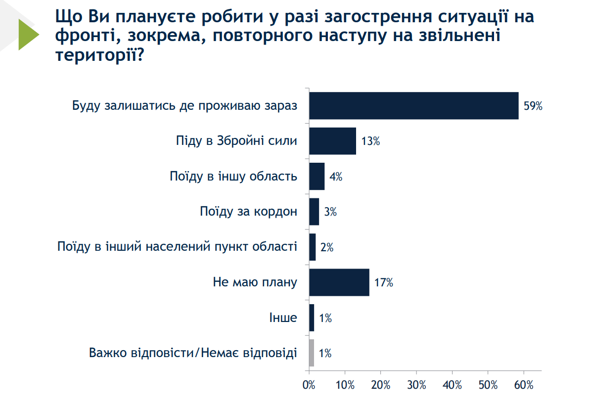 Також 13% респондентів заявили про намір піти захищати державу в складі Збройних сил у разі погіршення обстановки на фронті – це 25% чоловіків від усіх опитаних. Ще 4% у такій ситуації хочуть поїхати в інший регіон України, 3% – за кордон, 2% – у інший населений пункт своєї області, а 17% ще не мають плану дій.