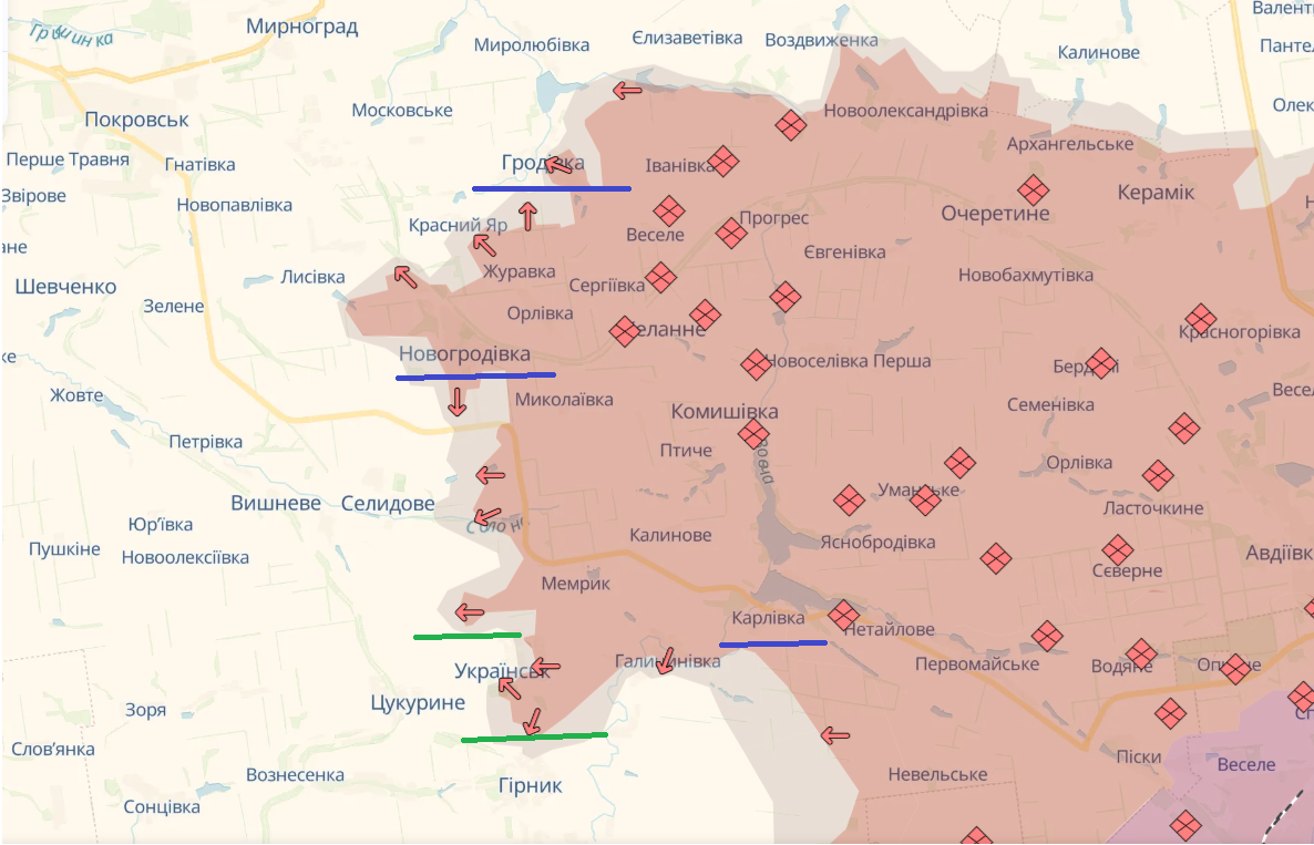 Якщо на початку серпня ЗС РФ одночасно наступали в напрямку Гродівки, Новогродівки та Карлівки (сині підкреслення), то зараз їм вдається просуватися лише на невеликій ділянці фронту, обходячи Українськ із двох боків (зелені підкреслення). На решті ділянок просування ворога відносно зупинено, хоча лінія оборони й залишається динамічною.