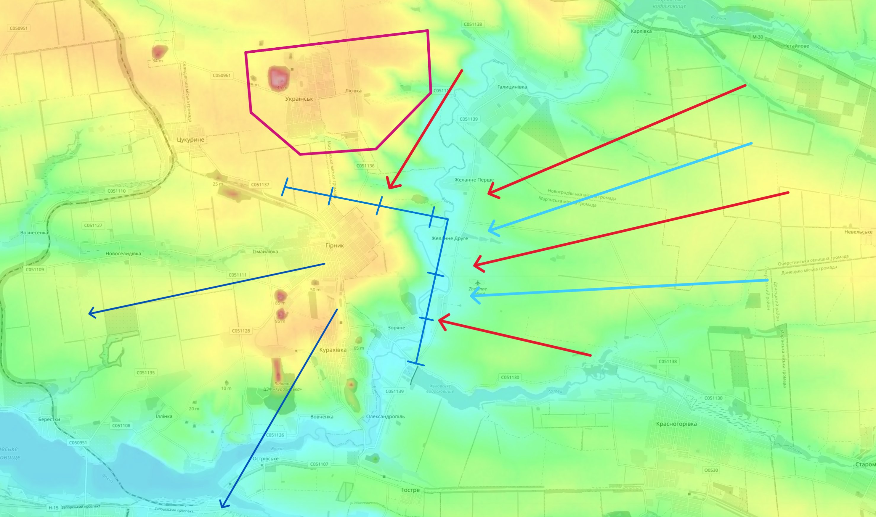 Наслідки, до яких може призвести таке просування ворога, дуже невтішні. Може йтися про втрату контролю відразу над кількома населеними пунктами, розташованими в низині поблизу річки Вовча. Для кращого розуміння додається карта рельєфу та ймовірний задум ворога, позначений стрілками зі сходу.