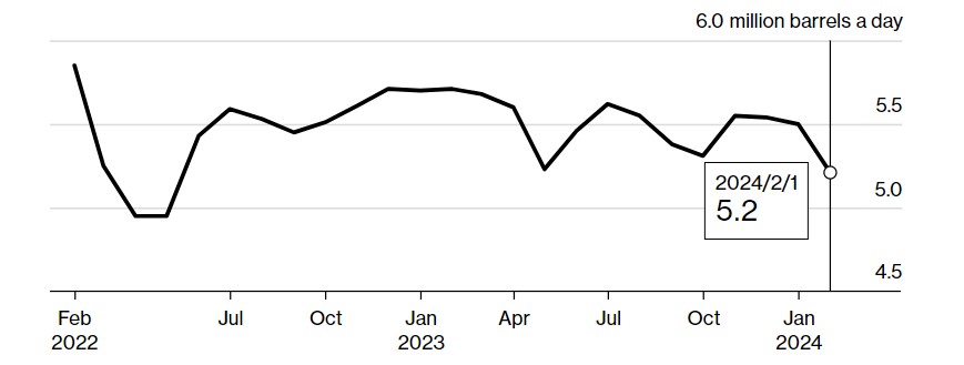 Падіння обсягів переробки досягло майже 380 тисяч барелів на добу порівняно з більшою частиною грудня (останнього місяця перед тим, як Україна почала завдавати ударів по російських НПЗ). За підрахунками Bloomberg, у лютому добове виробництво в Росії впало в середньому до 5,21 мільйона барелів, що є найнижчим показником з початку жовтня.