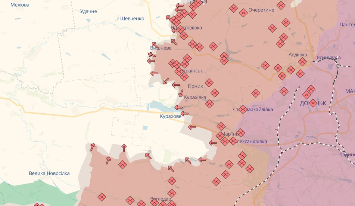 Згідно з даними порталу DeepState, у минулому місяці ворог досягнув найбільшого просування на Донеччині з жовтня 2023 року, окупувавши понад 490 квадратних кілометрів. Йдеться переважно про напрямок північніше та південніше Курахового, де росіяни реалізують свою звичну останнім часом тактику «кліщів». Тактику, якій українські сили не можуть ефективно протидіяти в обороні вже шостого великого населеного пункту за останні два місяці.