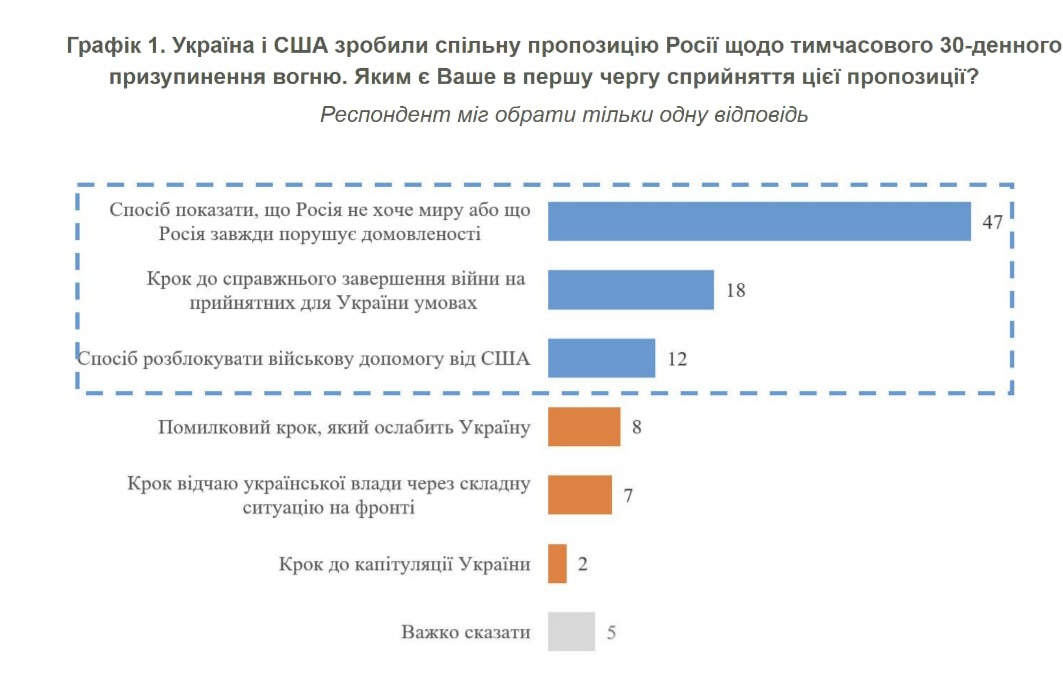 В Україні 77% громадян позитивно трактують пропозицію США щодо 30-денного припинення вогню, із них 47% громадян вважають, що тимчасове перемир'я — це спосіб показати, що Росія не хоче миру або що вона завжди порушує домовленості. Ще 18% переконані, що це є кроком до завершення війни на прийнятних для нашої країни вимогах. На думку 12% респондентів, така пропозиція є способом розблокувати військову допомогу від Сполучених Штатів Америки, свідчать результати опитування Київського міжнародного інституту соціології.