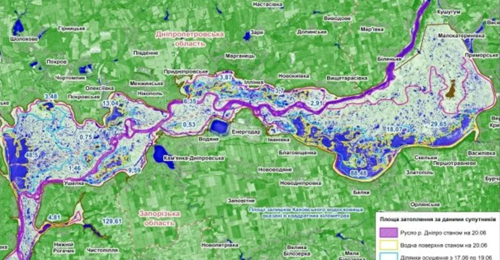 Отож на цих супутникових знімках Sentinel-2А вчені виявили велику кількість дрібних водойм площею 0,1 кв. км. Фахівці зазначають, що ці ділянки не слід враховувати під час обчислення залишків площі водосховища, позаяк вони не з'єднані з іншими водоймами та руслом Дніпра чи його відгалуженнями. Тож експерти прогнозують, що ці водойми швидко засохнуть.