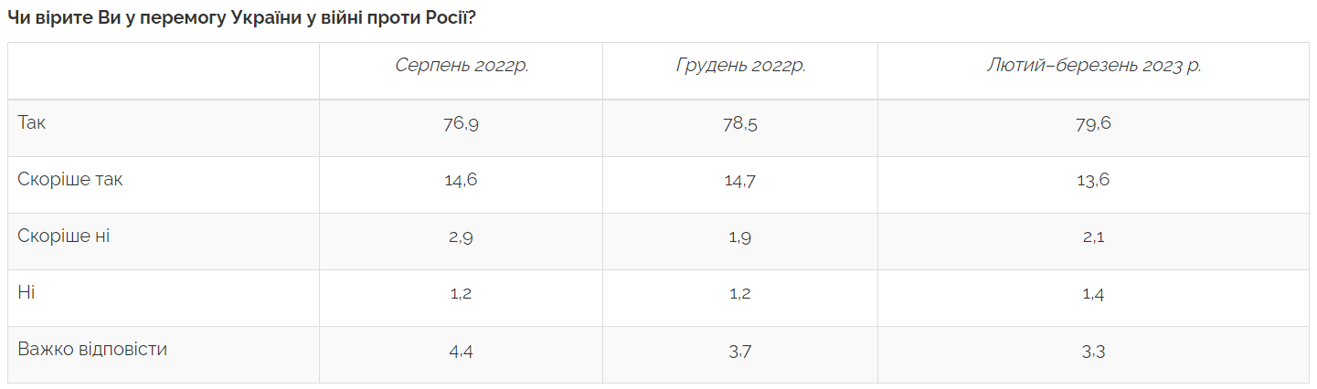 При цьому ще 3,5% від усіх опитаних не вірять у перемогу України, 3,3% не змогли визначитися з однозначною відповіддю.
