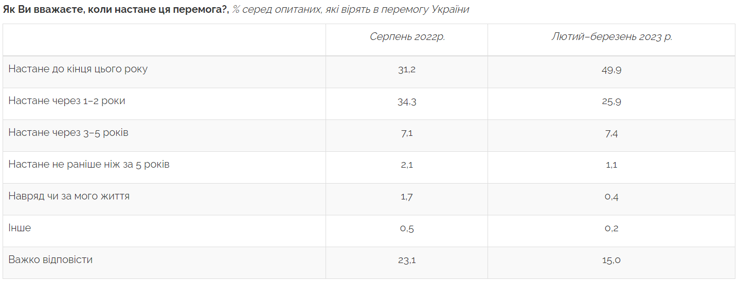 Зі згаданих 93,2% респондентів ще 26% висловили впевненість у завершенні війни на користь України через один-два роки, 7% – через три-п’ять років, 1% – не раніше, ніж через п’ять років, а 0,4% думають, що перемога може не настати за їхнього життя. 15% учасникам дослідження, які очікують успіху нашої держави, було важко відповісти на це запитання.