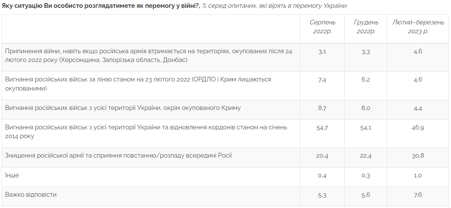 У порівнянні з результатами соціологічного дослідження, здійсненого в грудні минулого року, більше жителів (на 8,4%) стали вважати перемогою знищення армії РФ та сприяння розпаду держави-агресора. Варіант вигнання загарбників з усіх територій держави обрали менше респондентів (на 7,2%), але інші відповіді не зазнали суттєвих змін.