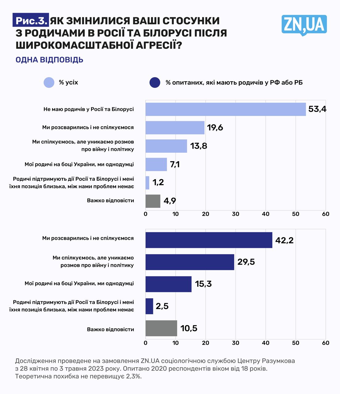 Згідно з результатами, близько половини респондентів (46,6%) мають родичів у РФ або Білорусі. Але 42,2% з таких відповіли на запитання "Як змінилися ваші стосунки з родичами в Росії та Білорусі?", що посварилися та не спілкуються з ними. "А майже кожен третій (29,5%) обрав "страусову стратегію": "Я про це не говорю – значить цього немає", тобто варіант "ми спілкуємось, але уникаємо розмов про війну і політику (див. рис. 3)", – зазначила експерт.