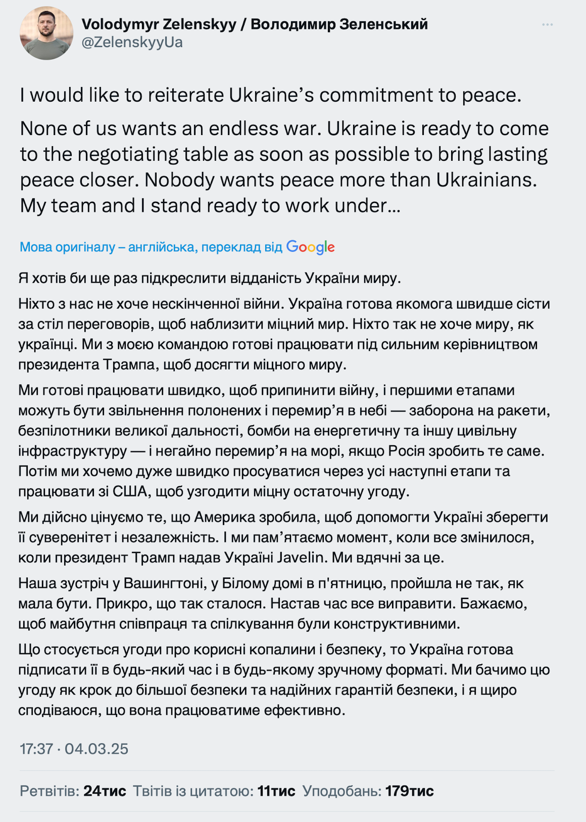 Нагадаємо, через кілька днів після суперечки у Білому домі президент Володимир Зеленський заявив про готовність України до мирних перемовин та підписання угоди про рідкісноземельні метали. Він запропонував, якими можуть бути перші кроки до встановлення миру: обмін полоненими "всіх на всіх" та встановлення перемир'я у повітрі та в морі. Після цього президент США Дональд Трамп під час виступу у Конгресі розповів про "важливий лист" від Зеленського, в якому український лідер заявив, що "ніхто не хоче миру більше, ніж українці".