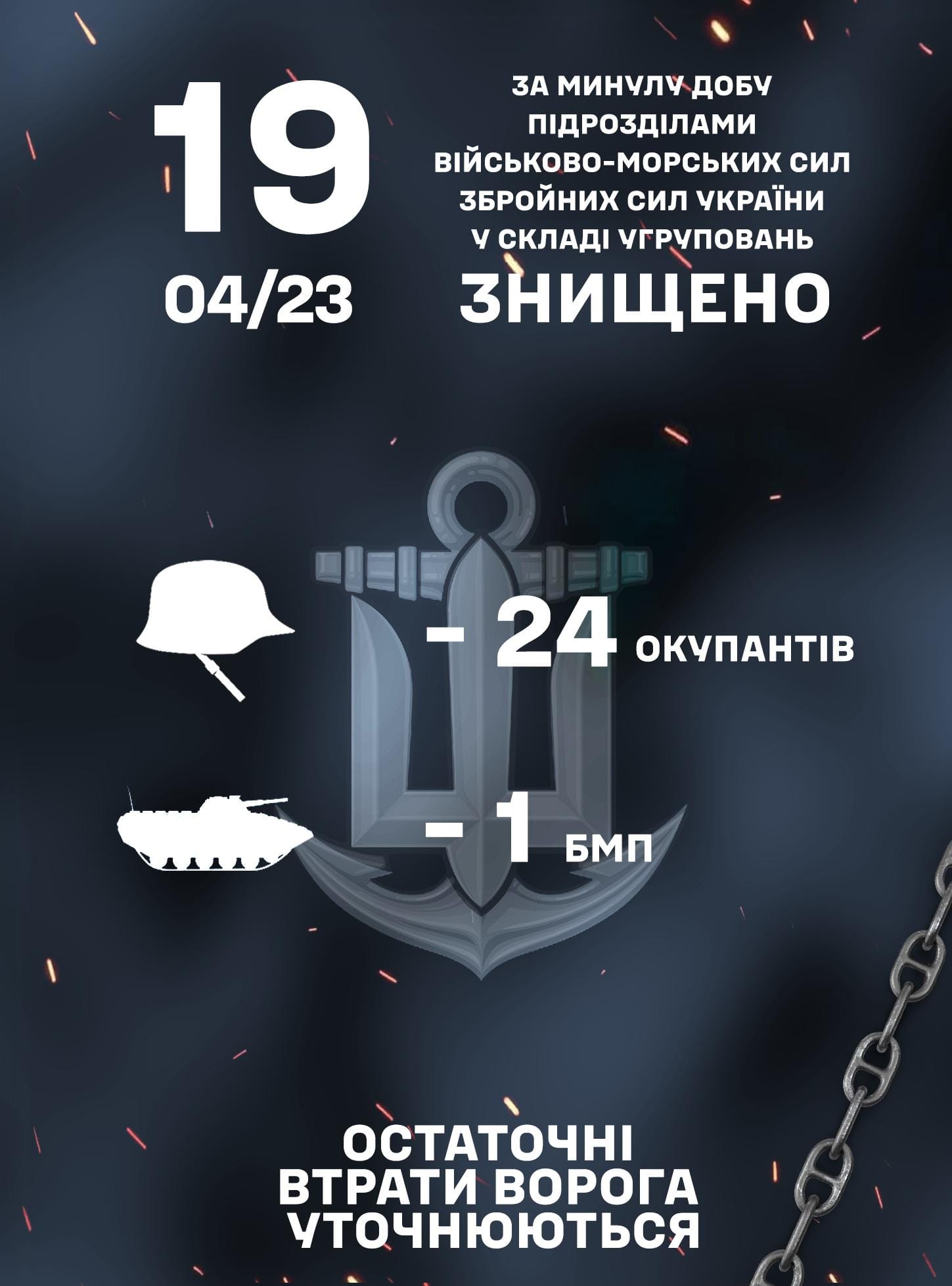 "Минулої доби, підрозділами ВМС ЗС України було знищено 24 окупанти та одну БМП. Остаточні втрати ворога уточнюються", - йдеться в повідомленні.