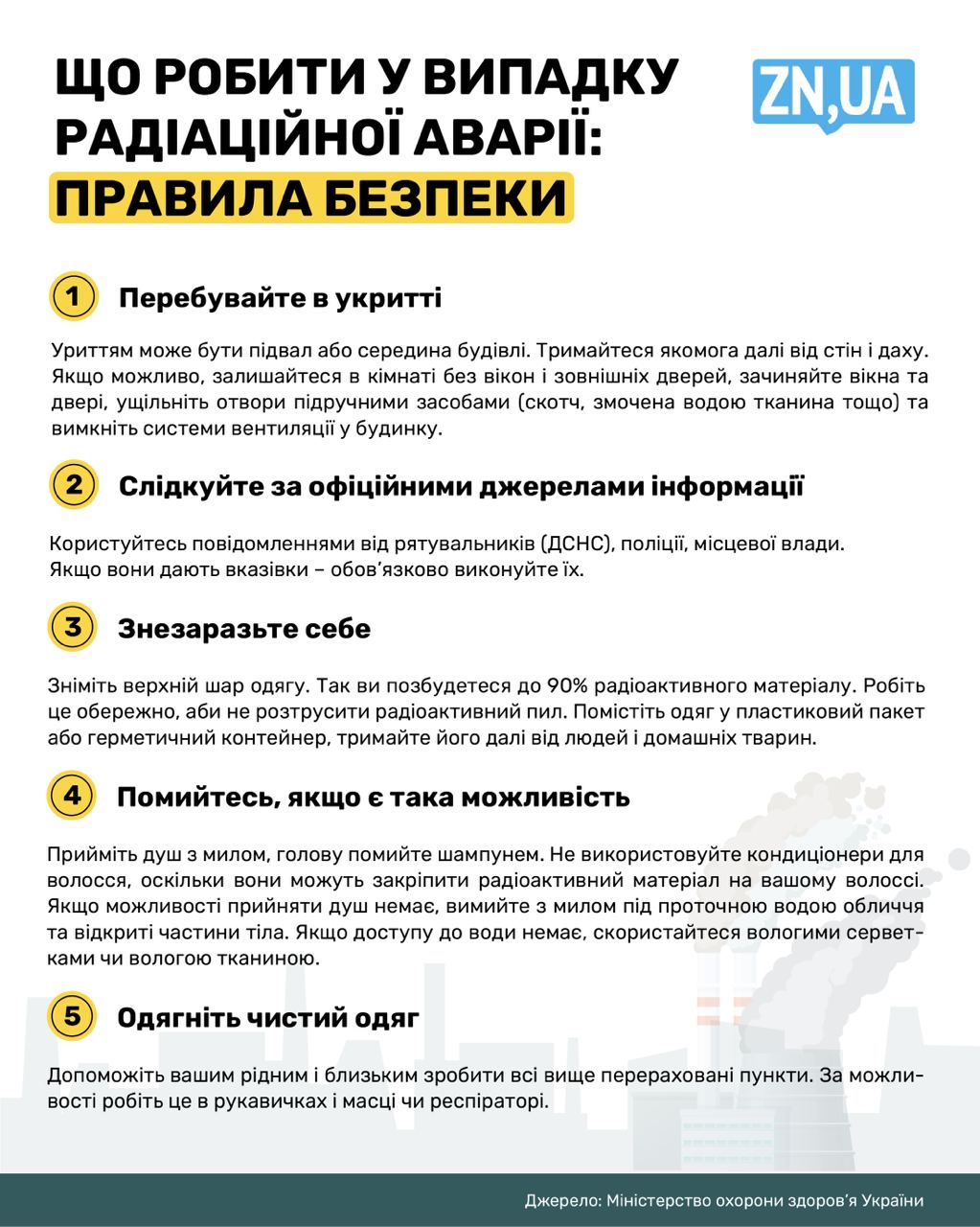 "Органи місцевої влади повідомлять про розташування пунктів евакуації, а також найбезпечніші маршрути пересування, якщо ви здійснюватимете евакуацію власним автомобілем. Дотримуйтесь інструкцій та зберігайте спокій", - наголошують в МОЗ.