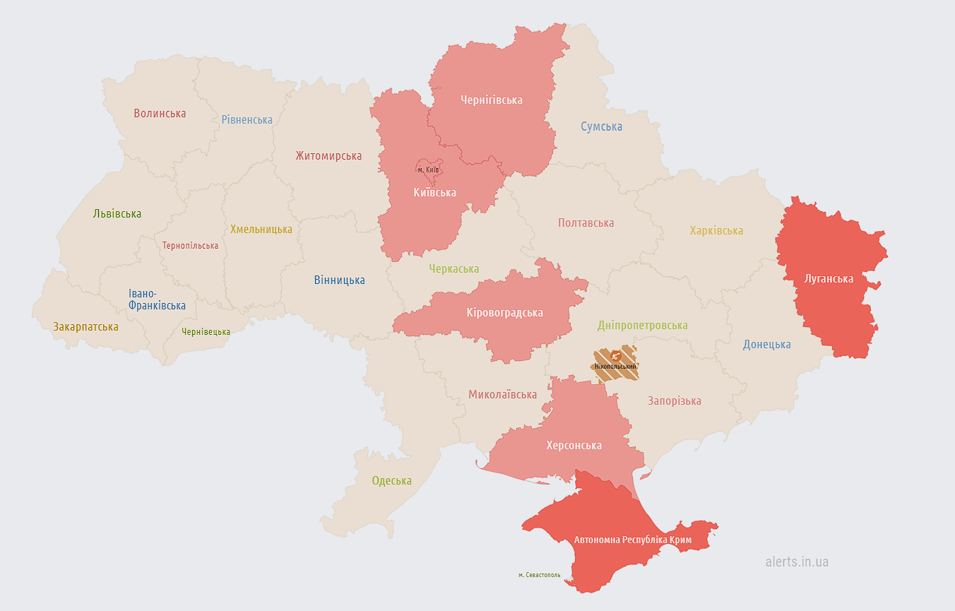 Станом на 23:50, тривогу оголошено в Чернігівській та Київській областях, а також місті Києві.