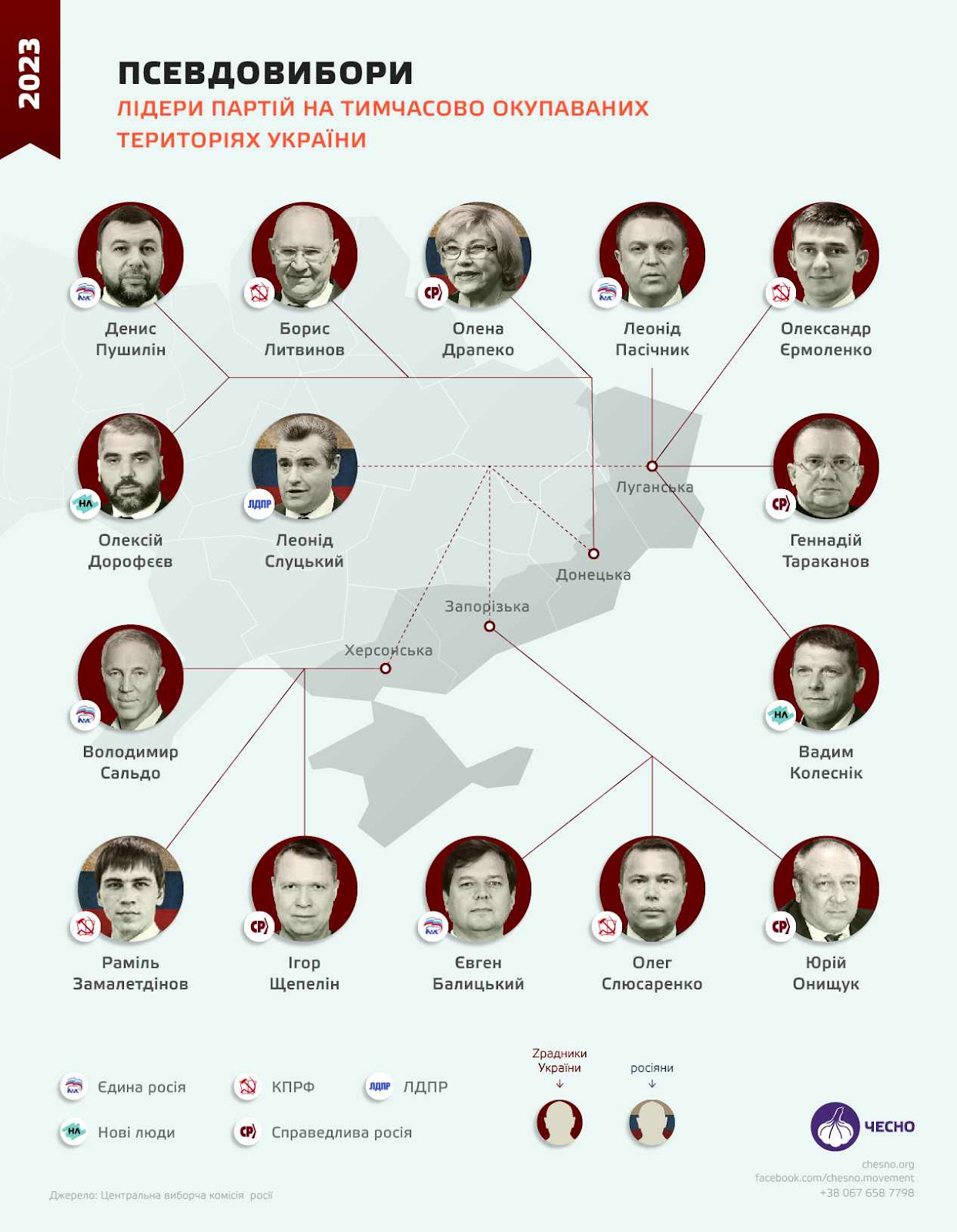 На чолі «виборчих списків» партії «Единая Россия» – керівники окупаційних адміністрацій – Євген Балицький, Володимир Сальдо, Денис Пушилін та Леонід Пасічник. Від російської партії ЛДПР всюди першим номером «балотується» її лідер Лєонід Слуцкій, зазначає Рух ЧЕСНО.
