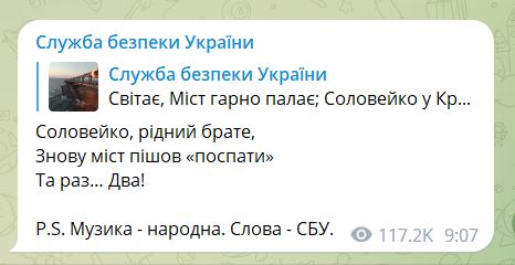 Згодом на офіційному Telegram-каналі СБУ прокоментувала події так: «Соловейко, рідний брате, Знову міст пішов «поспати». Та раз… Два! P.S. Музика - народна. Слова - СБУ».