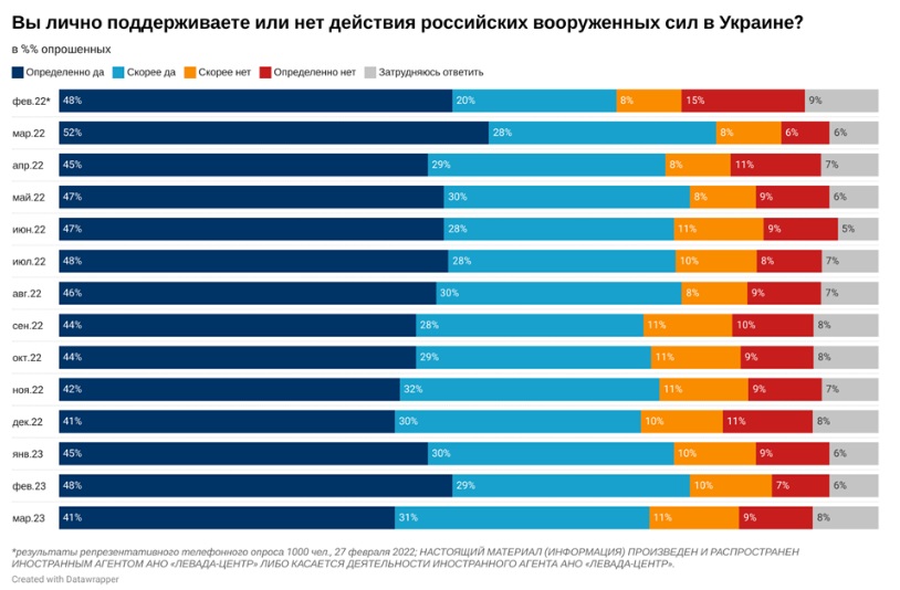 Згідно з опитуванням, 41% респондентів безперечно підтримують дії російської армії в Україні, а в лютому цей показник був на рівні 48%. 31% швидше підтримують, а в лютому ця цифра була трохи нижчою – 29%. Не підтримують війну 20% опитаних росіян, а в лютому так висловились 17%.