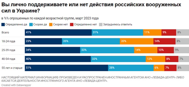 Найвищий рівень підтримки дій російських збройних сил в Україні характерний для постійних глядачів російського телебачення – 79% – та прихильників Владіміра Путіна – 81%. А якщо говорити про вікові показники, то підтримка війни найбільш поширена серед старших людей – у віці понад 55 років і старше війну підтримують 79% жінок і чоловіків 77% чоловіків.