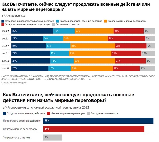 Прихильників мирних переговорів у суспільстві, як і раніше, трохи більше, ніж прихильників продовження військових дій (48% проти 42% наприкінці березня). За мирні переговори найчастіше виступають насамперед молоді люди, жінки та опозиційно налаштовані громадяни. За продовження військових дій частіше виступають представники старших поколінь, чоловіки та прихильники влади. Але навіть у цих групах немає єдиної думки щодо цього питання.