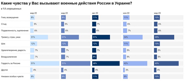 У 43% росіян військові дії викликають «гордість за Росію». 35% відчувають «тривогу, страх, жах», а «гнів, обурення» і «шок» – по 10%.