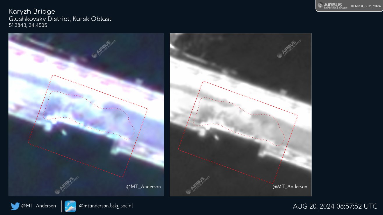 Внаслідок удару Збройних сил України зазнав пошкоджень третій міст через річку Сейм, який розташований біля села Кариж в Глушковському районі Курської області РФ. Супутникові знімки моста опублікував OSINT-аналітик MT Anderson.