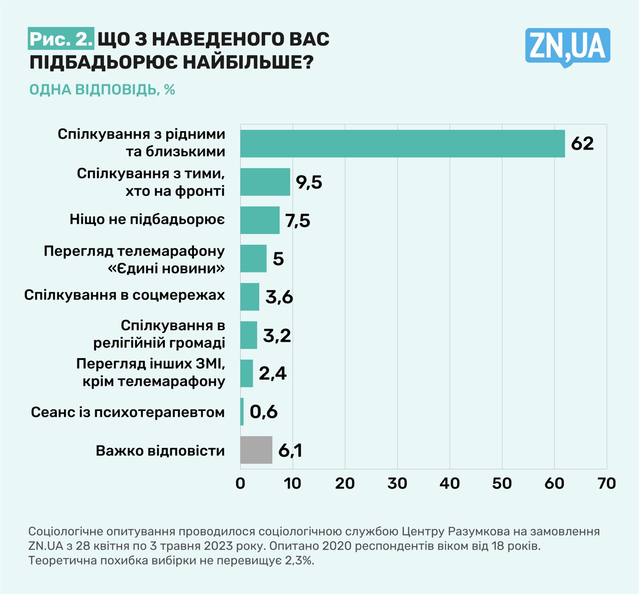 На запитання "Що вас підбадьорює найбільше?" переважна більшість опитаних (62%) відповіла "спілкування з рідними та близькими". На, другому місці хоч і з великим відривом, — "спілкування з тими, хто на фронті"(9,5%).