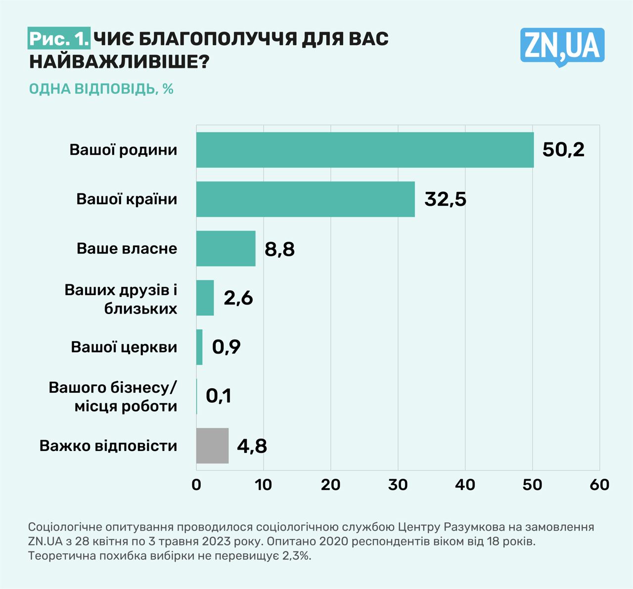 На запитання "Чиє благополуччя для вас найважливіше?" 50,2% українців відповіли, що вважають благополуччя своєї родини найважливішим для себе, респонденти поставили благополуччя країни (32,5%) на друге місце, свідчать результати опитування, яке нещодавно провів Центр Разумкова на замовлення ZN.UA.