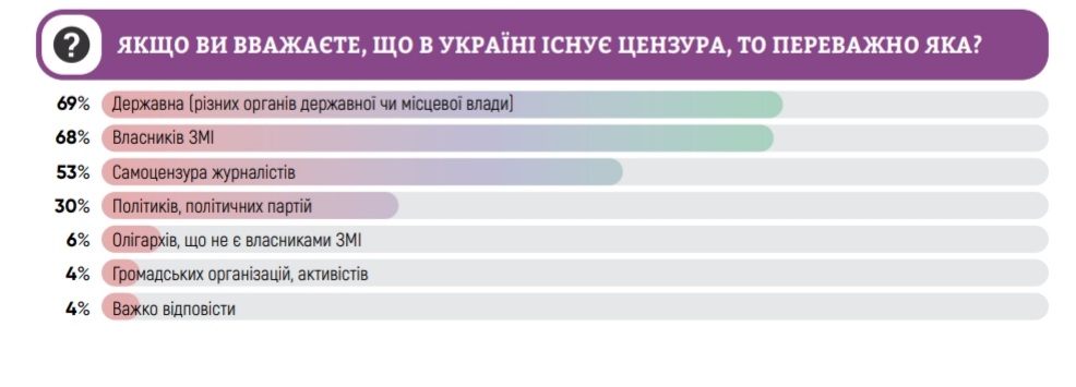 Представники медіа, які визнавали наявність цензури, зазначили, що вона здійснюється з боку різних органів державної чи місцевої влади, а також власників ЗМІ. На третьому місці – самоцензура журналістів.