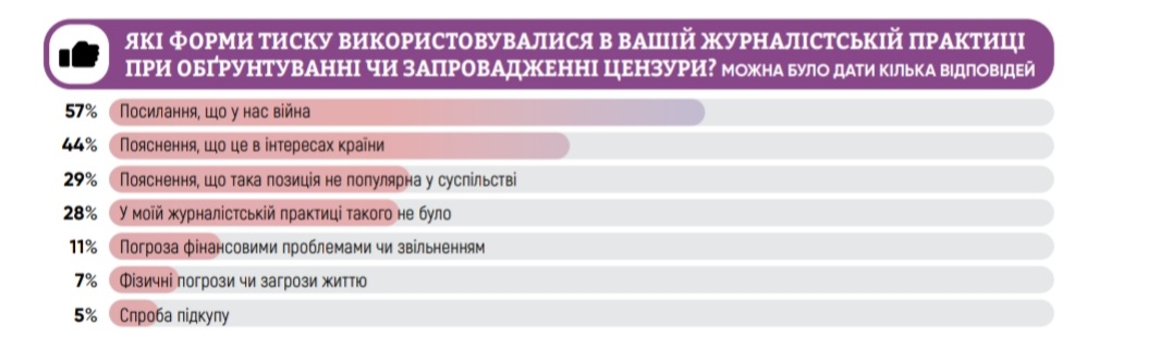 журналістам або громадськості суспільно важливої інформації (51% опитаних), цензурування готових матеріалів або заборону оприлюднення певної інформації (22%) та відмови в акредитації (17%).