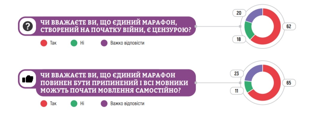 "2/3 опитаних переконані в тому, що єдиний марафон має бути припинений, і всі мовники можуть вести мовлення самостійно, проти виступають 11%, а 23% не визначилися зі своєю позицією з цього питання", - йдеться в повідомленні.
