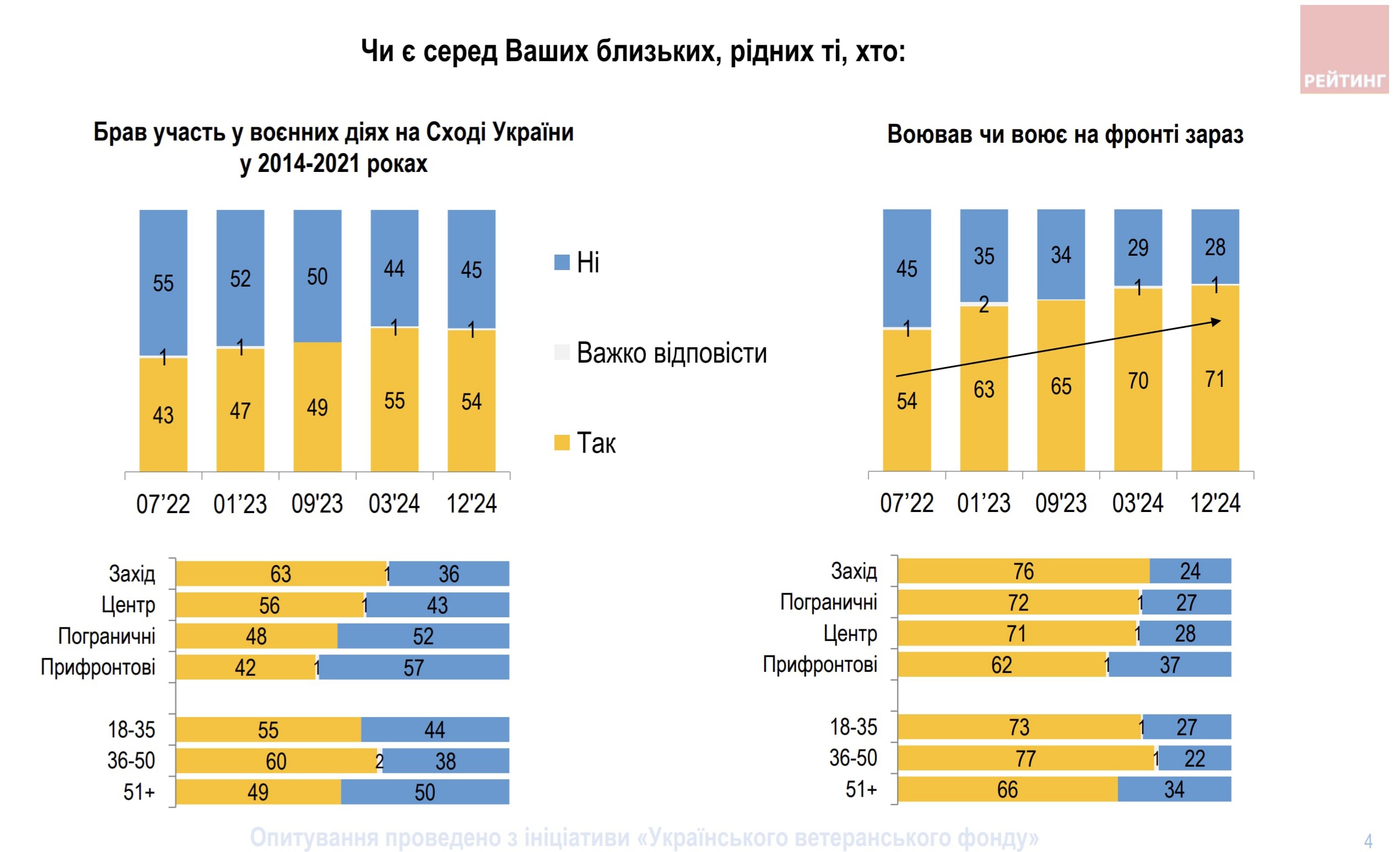 Більшість українців (54%) мають серед близьких та рідних тих, хто брав участь у бойових діях на сході у період з 2014 по 2021 рік. Водночас 71% громадян зазначили, що серед близьких є ті, хто воював чи воює на фронті від початку повномасштабного вторгнення РФ в Україну, свідчать результати опитування, проведеного 5-6 грудня 2024 року Соціологічною групою "Рейтинг" .