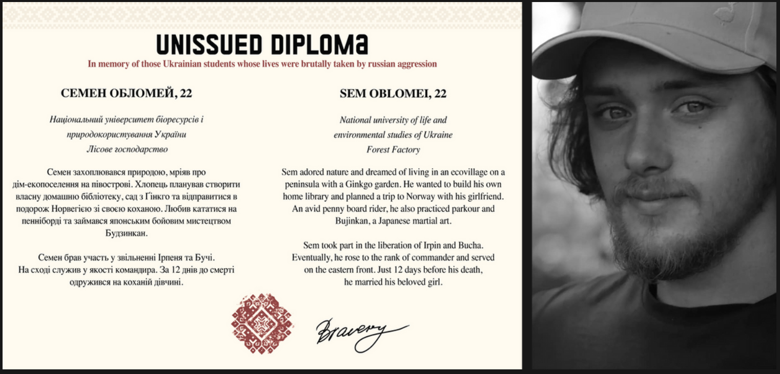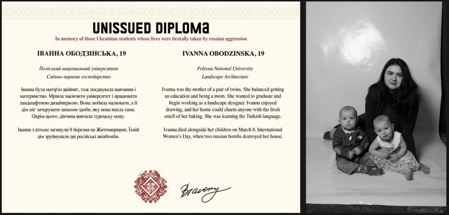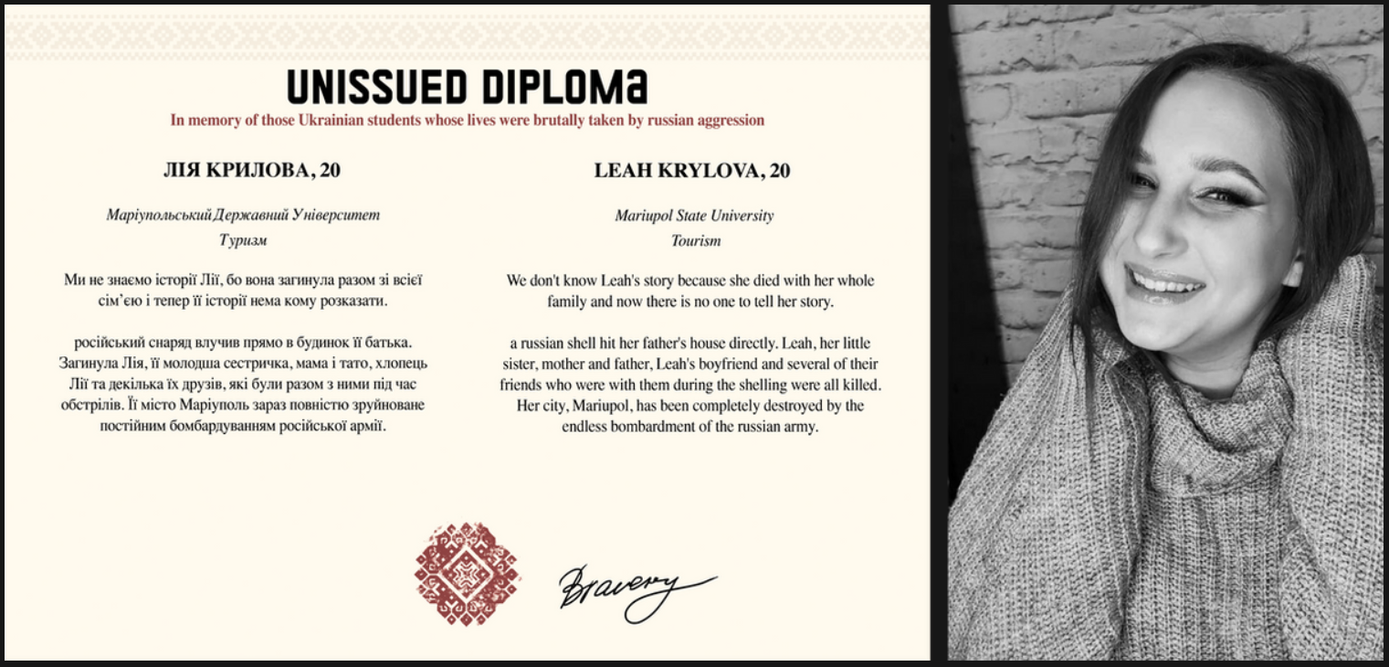 Проєкт Unissued Diplomas — «Невидані дипломи» — організувала команда українських студентів із понад 20 країн світу. Він висвітлює 36 історій, зібраних спільно з фондом «Меморіал», і демонструє внесок студентства в українську боротьбу за свободу. Кожна історія — невручений диплом. За кожним некрологом — історія життя і смерті, за кожною втратою — реальна особа.
