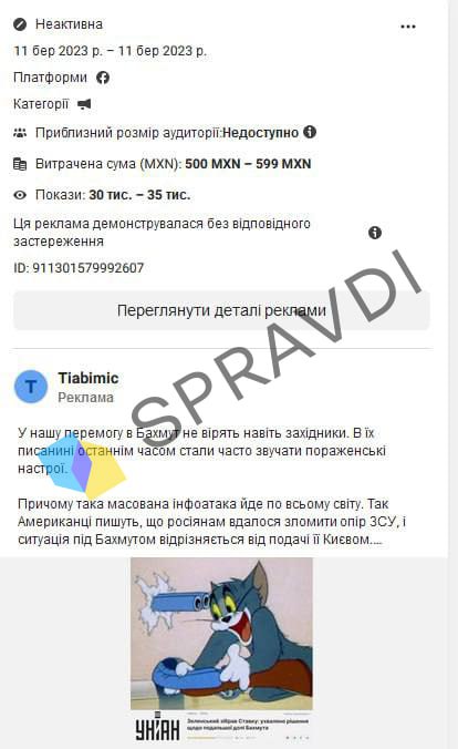 У межах атаки ворог розповсюджує кілька пропагандистських меседжів через рекламу від анонімних каналів, у тому числі щодо бойових дій в районі міста Бахмут Донецької області . Йдеться про такі фейки: