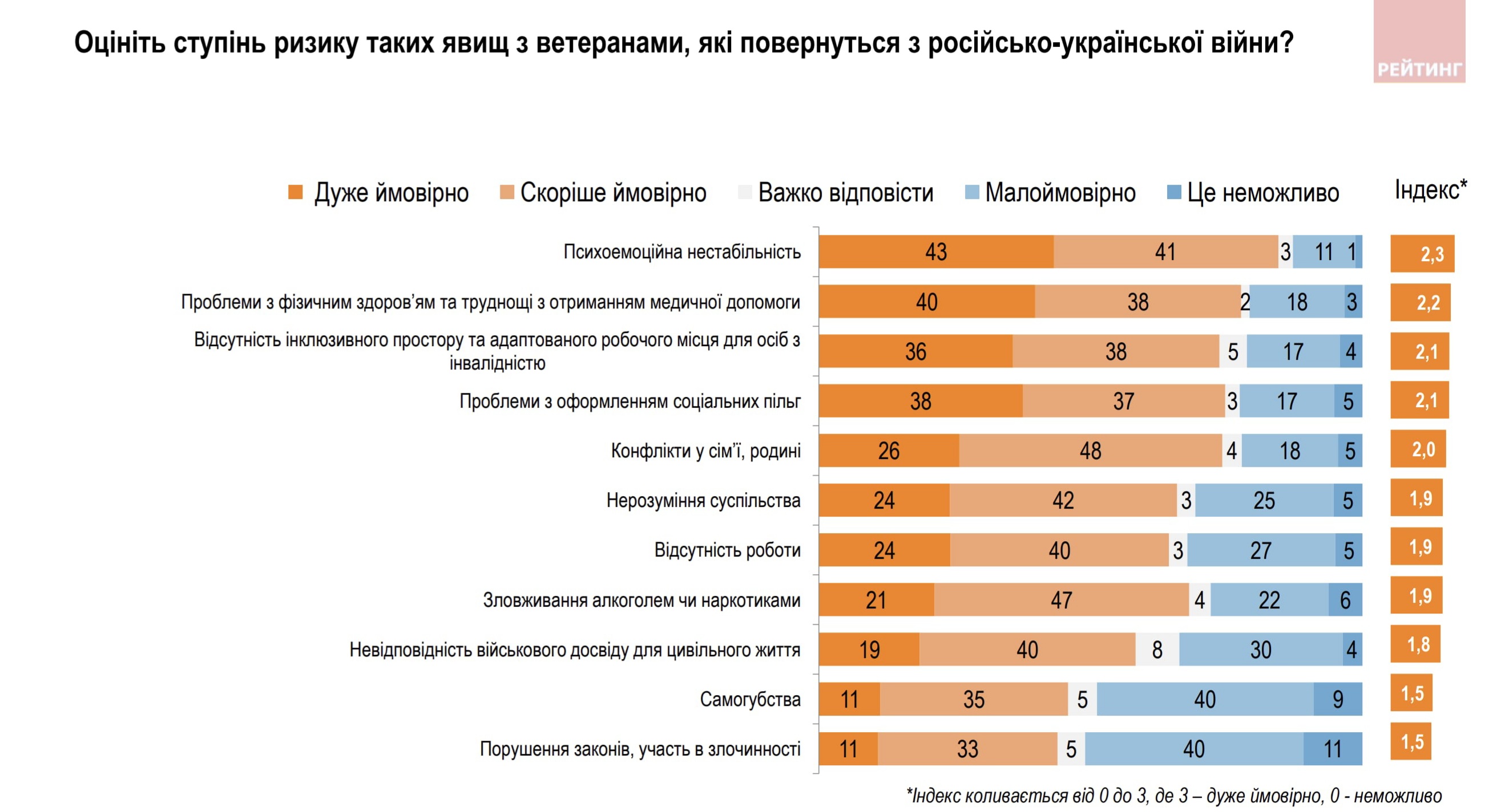 Зазначається, що порівняно з березнем цього року, зросла кількість тих, хто бачить ризики у зловживанні ветеранами наркотиками, алкоголем, у порушенні ними законів та участі у злочинності. Водночас серед громадян дещо зменшилися очікування щодо ризиків щодо самогубств та відсутності роботи.