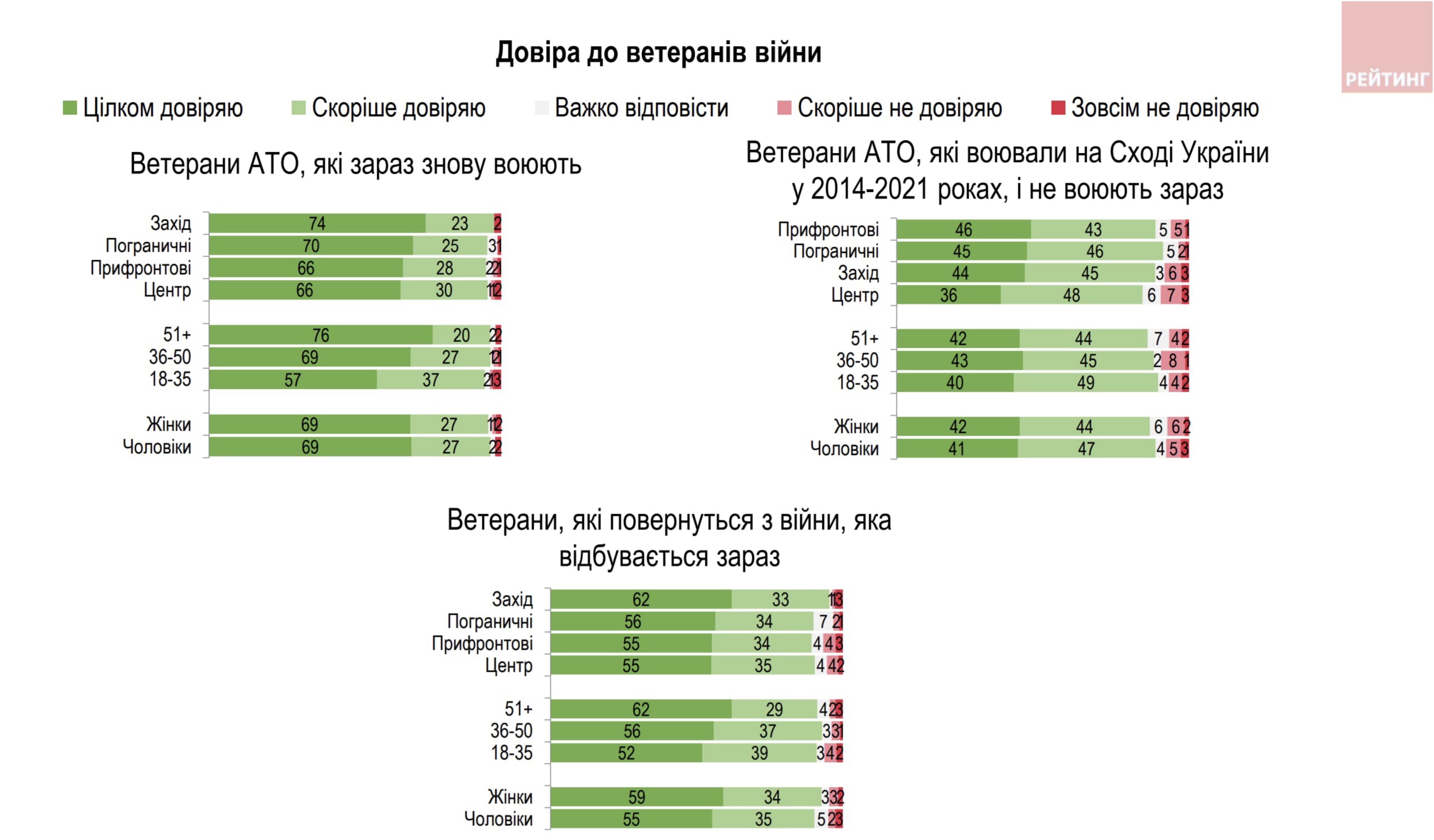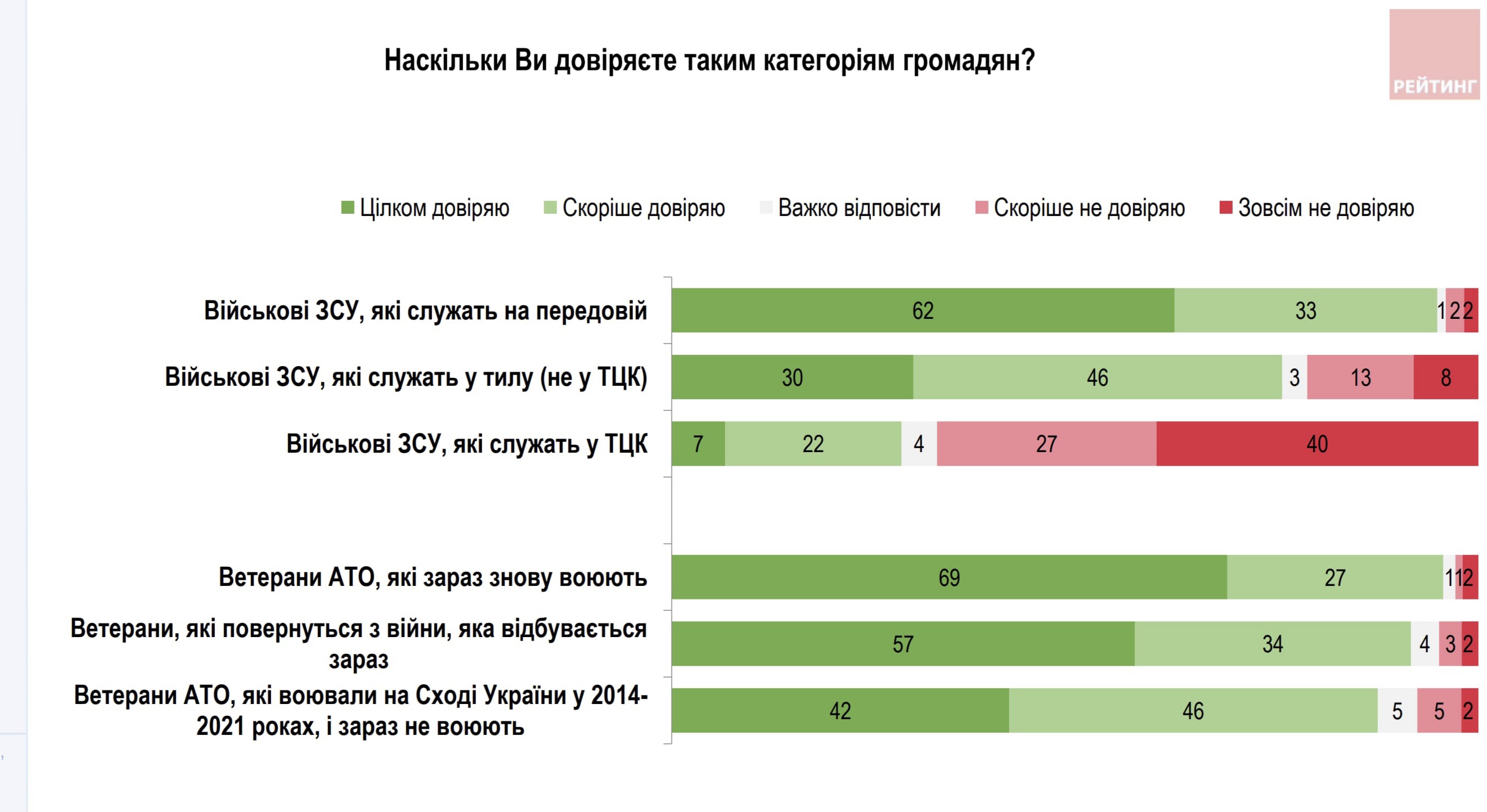 Військові і надалі мають найвищі показники довіри в українському суспільстві, однак є значні відмінності у рівні довіри до категорій військовослужбовців. Ветеранам АТО, які воюють на фронті, довіряють 96% громадян, ветеранам повномасштабної війни — 91%, ветеранам АТО (ООС) 2014-2021 рр — 88%. Військовим Збройних Сил України, які воюють на передовій, довіряють 94% опитаним, а тим, хто служить у тилу (не в територіальних центрах комплектування та соціальної підтримки) — 76%, зазначає Соціологічна група "Рейтинг", яка 5-6 грудня 2024 року провела опитування.