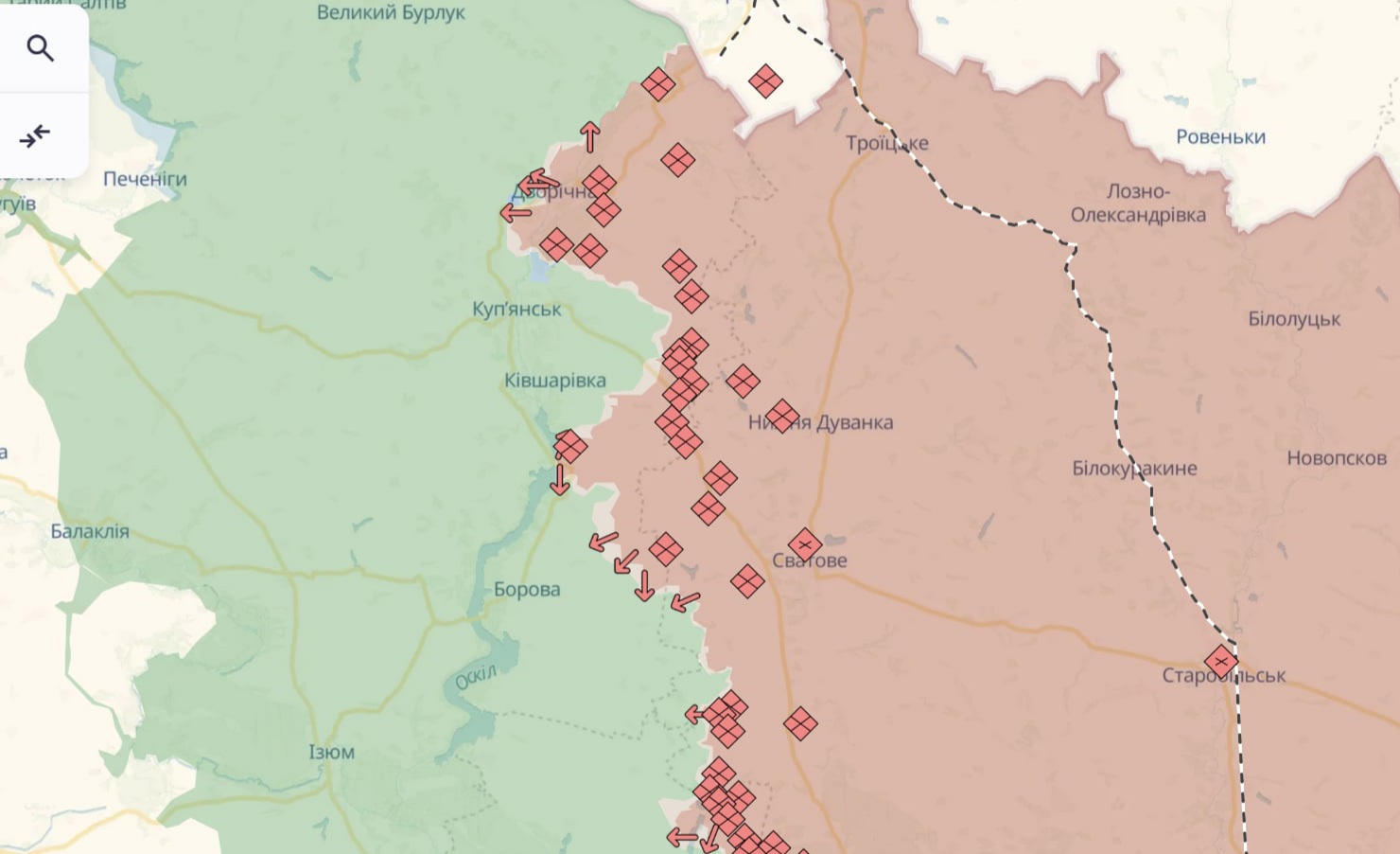 Українським військовим вдалося відтіснити війська РФ на північ від села Западне Харківської області. Однак росіяни прагнуть захопити село Фиголівка та постійно здійснюють штурми селища Дворічна. Командир 429-го окремого полку безпілотних систем "Ахіллес" Юрій Федоренко наголосив, що на цьому напрямку загарбники намагаються розширити свій правобережний плацдарм біля річки Оскіл.