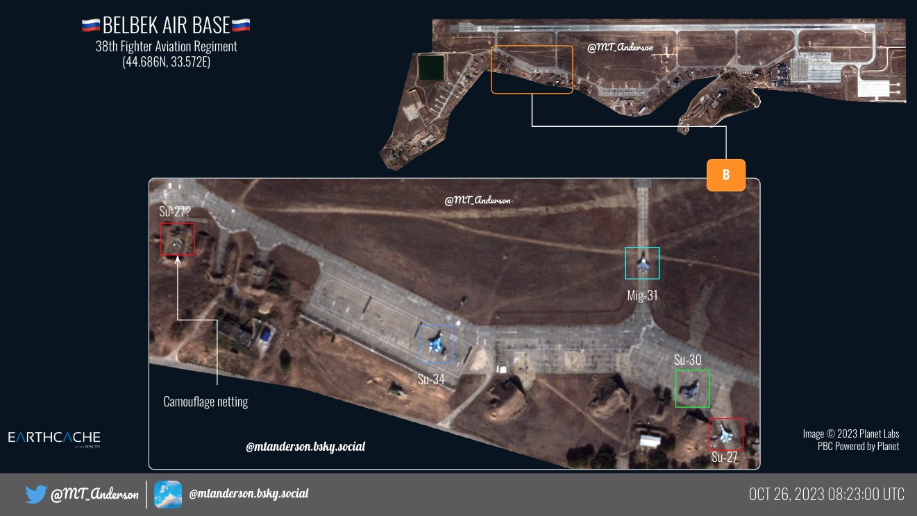 На зображеннях, зроблених 26 жовтня 2023 року, експерт помітив різну винищувальну та штурмову авіацію, серед якої можуть бути літаки Су-27, Су-30 і Су-34, а також чотири справжні МіГ-31, які в певній модифікації можуть застосовуватися для пусків ракет “Кинджал”.