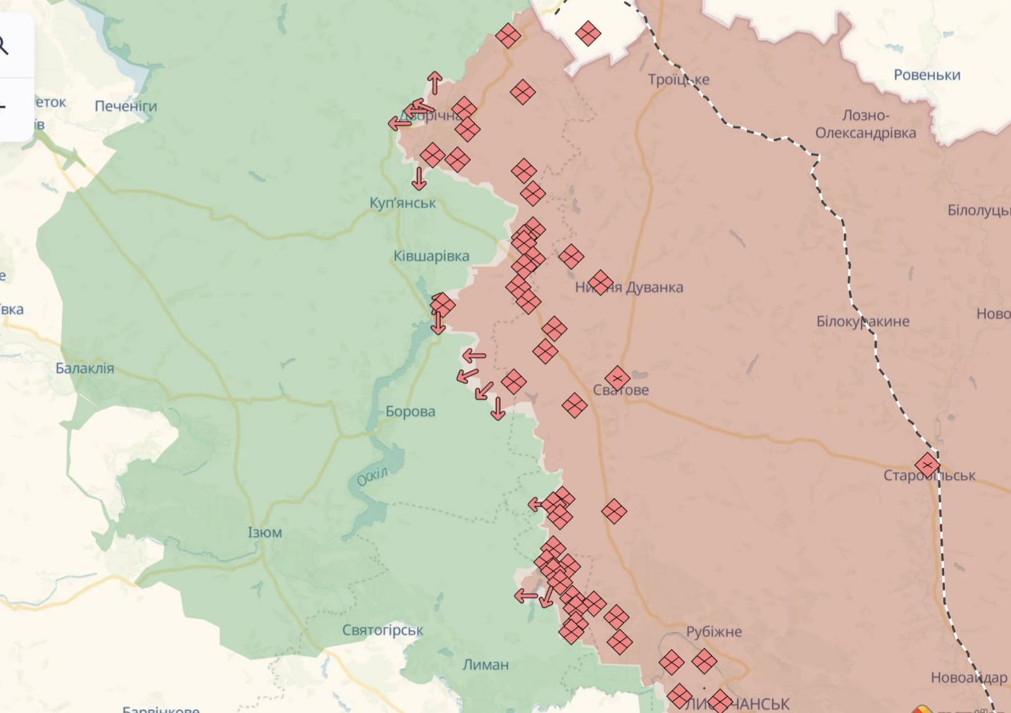 У DeepState зазначили, що армія РФ просунулася та продовжує закріплюватися на плацдармах на правому березі Осколу в районах Дворічної та Новомлинська.