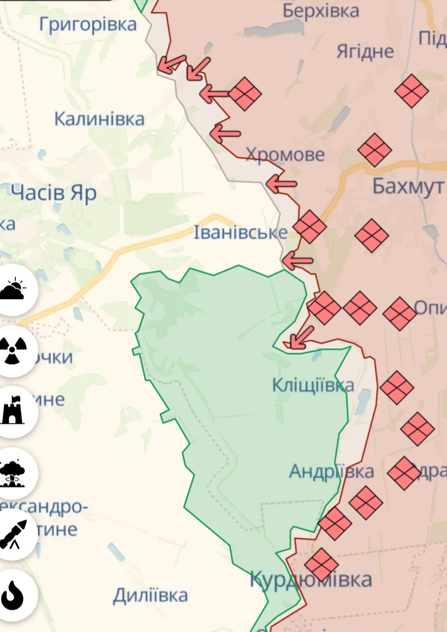 Командувач Сухопутних сил ЗСУ Олександр Сирський зазначив, що на бахмутському напрямку метою окупантів є наступ на Часів Яр, Костянтинівку, Дружківку, Слов’янськ та Краматорськ.