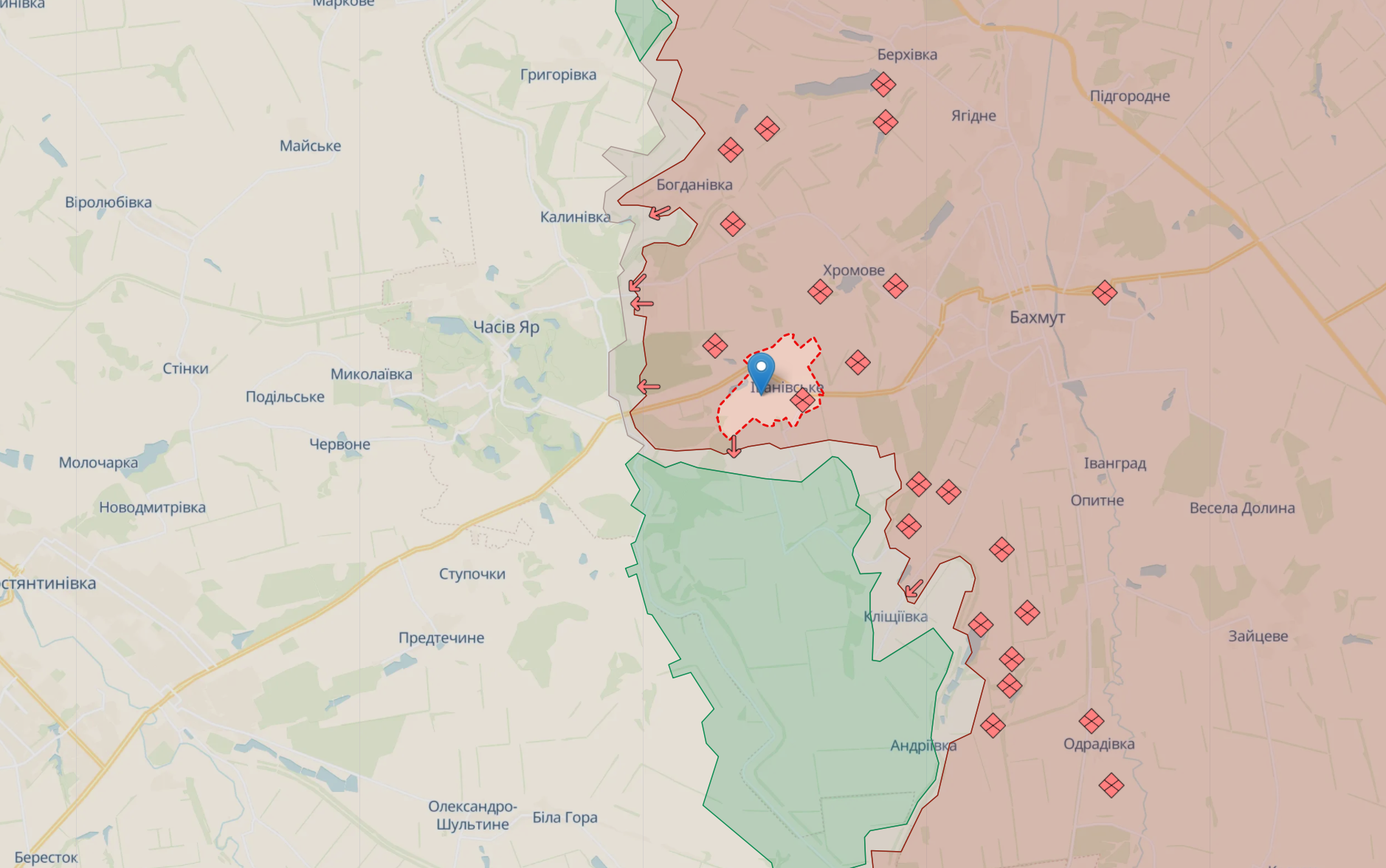 У DeepState повідомили, нібито російські військові окупували село Іванівське у Бахмутському районі Донецької області. Та у ЗСУ спростували цю інформацію. Речник оперативно-стратегічного угруповання військ "Хортиця" Назар Волошин у коментарі Liga.net наголосив, що Сили оборони зберігають контроль над цим населеним пунктом, тоді як окупанти без упину штурмують його та обстрілюють з усіх видів озброєння.