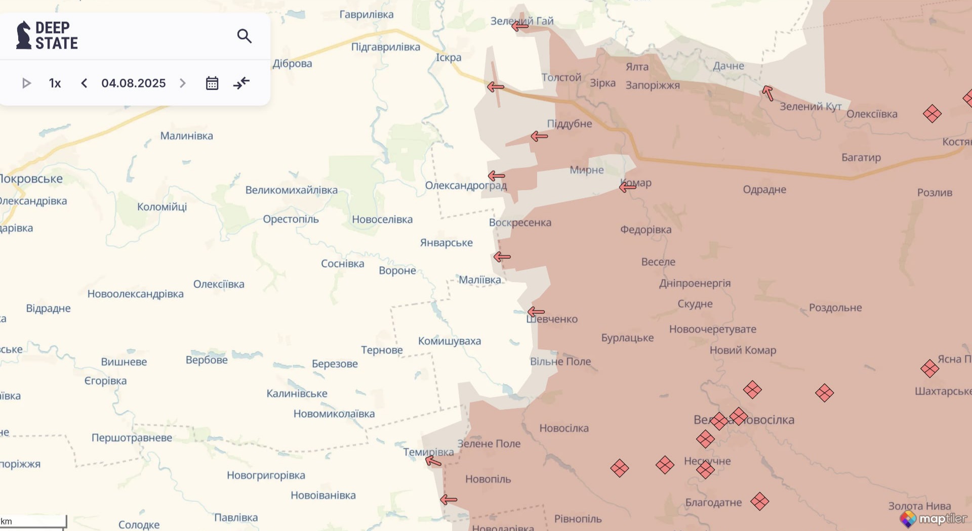 Загарбники також прагнуть розвинути свій наступ на новопавлівському напрямку та атакують у районах Темирівки, Толстого, Воскресенки, Мирного, Олександрограда, Маліївки.