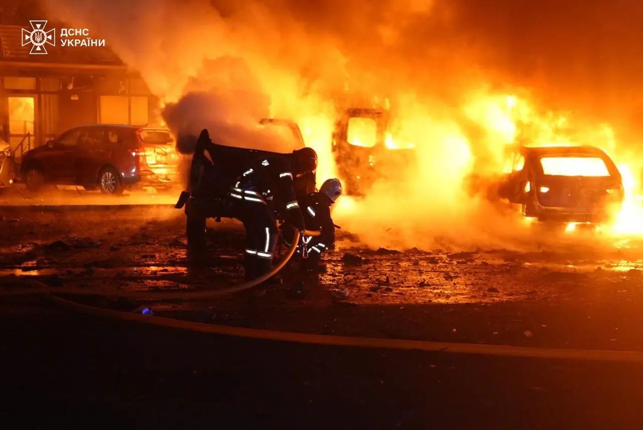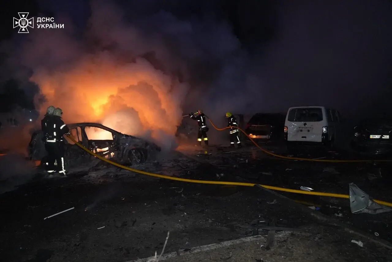 Пізніше начальник Сумської обласної військової адміністрації Володимир Артюх розповів, що рятувальники вже загасили пожежу. За попередніми даними згоріло сім автомобілів. Наразі рятувальники перевіряють, чи є постраждалі внаслідок удару.