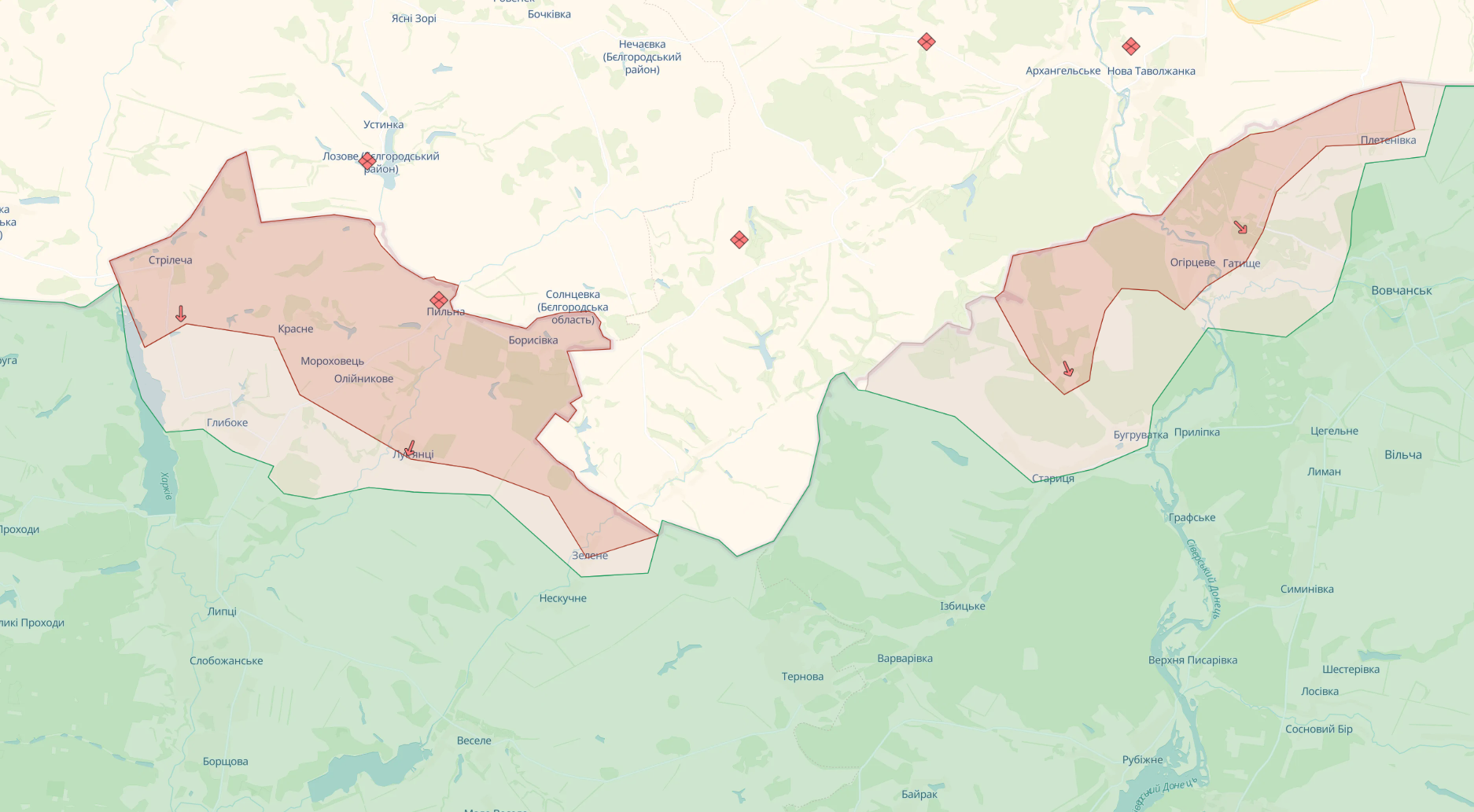 Ресурс DeepState опівночі на понеділок оновив дані, згідно з якими росіяни захопили ще три села на півночі Харківщини – Мороховець, Олійникове та Зелене.