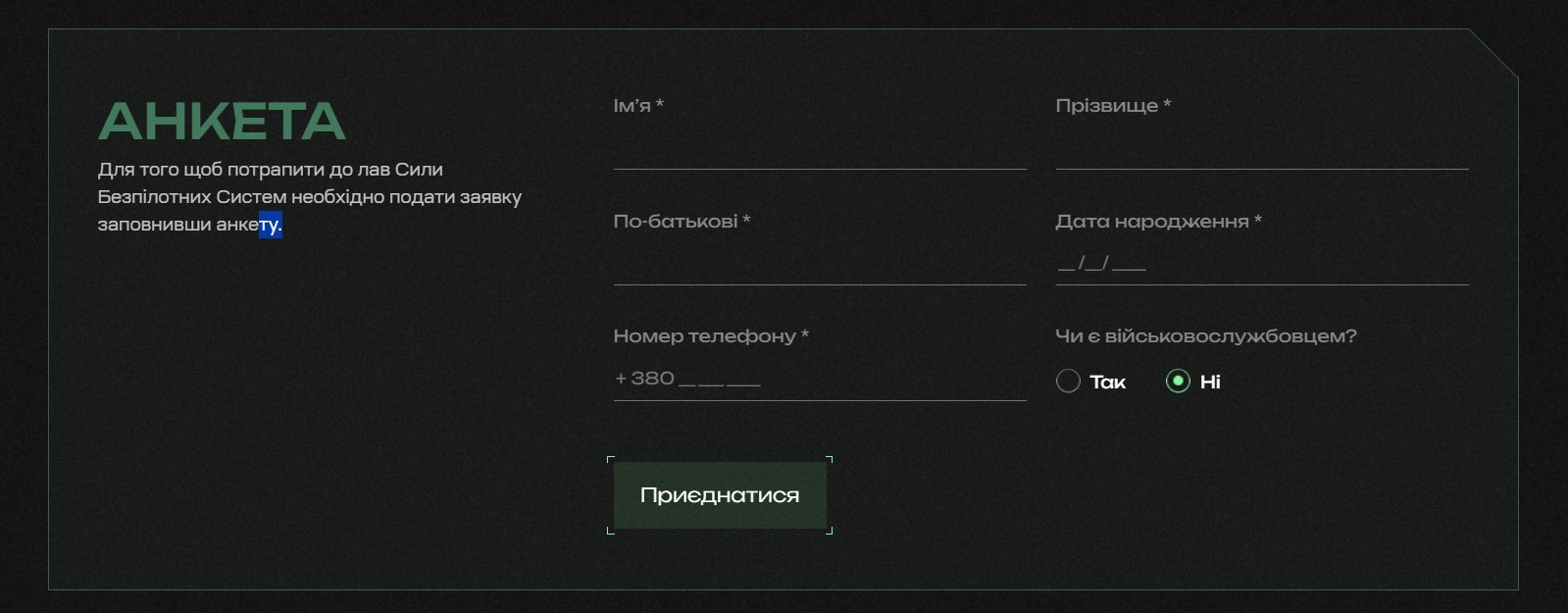 Також на сайті Сил безпілотних систем можна заповнити анкету для того, щоб потрапити до їхніх лав.