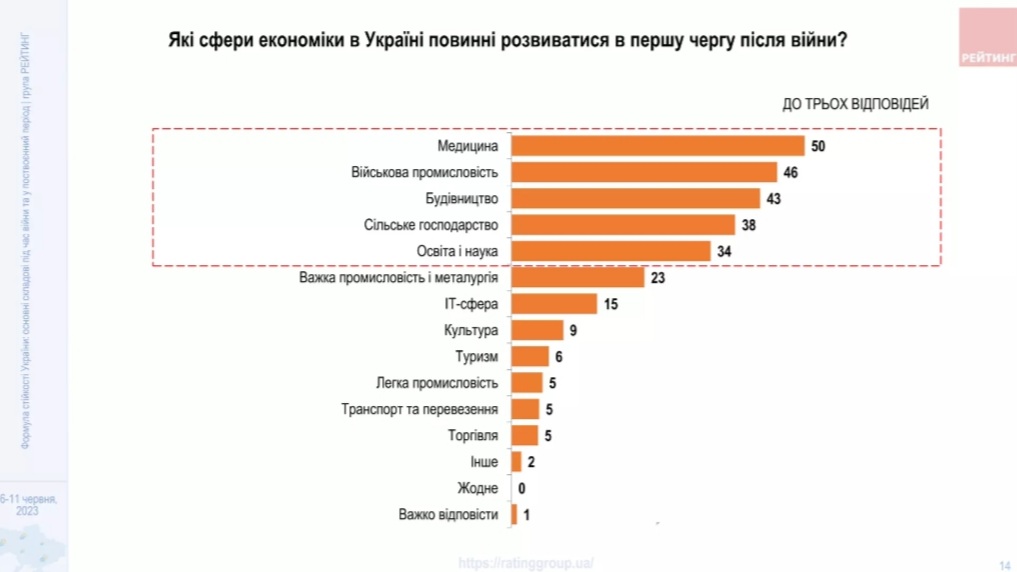 На думку українців такі сфери як: медицина (50%), військова промисловість (46%), будівництво (43%), сільське господарство (38%) та освіта і наука (34%) мають розвиватися в першу чергу після завершення війни в Україні.