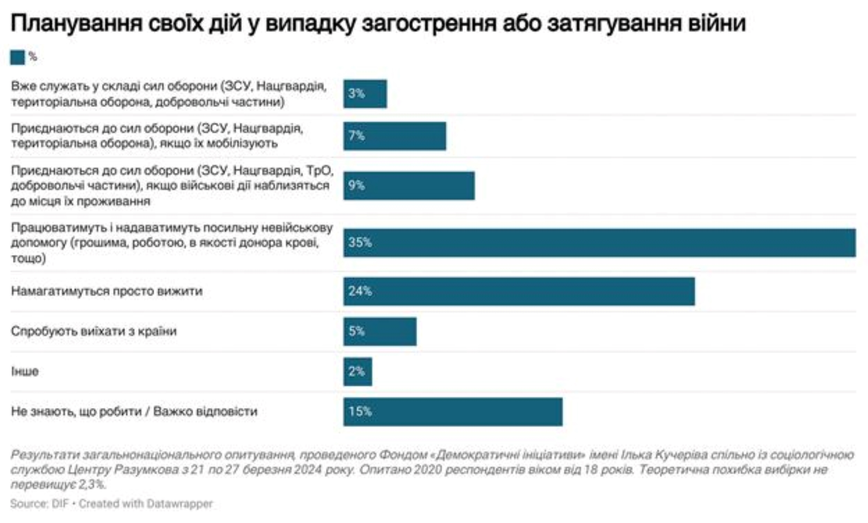 Фонд "Демократичні ініціативи" на початку лютого 2022 року, перед повномасштабним вторгненням РФ запитав українців про те, що вони робитимуть у разі війни. Тоді 22,5% респондентів заявили про готовність воювати на фронті — висока цифра.