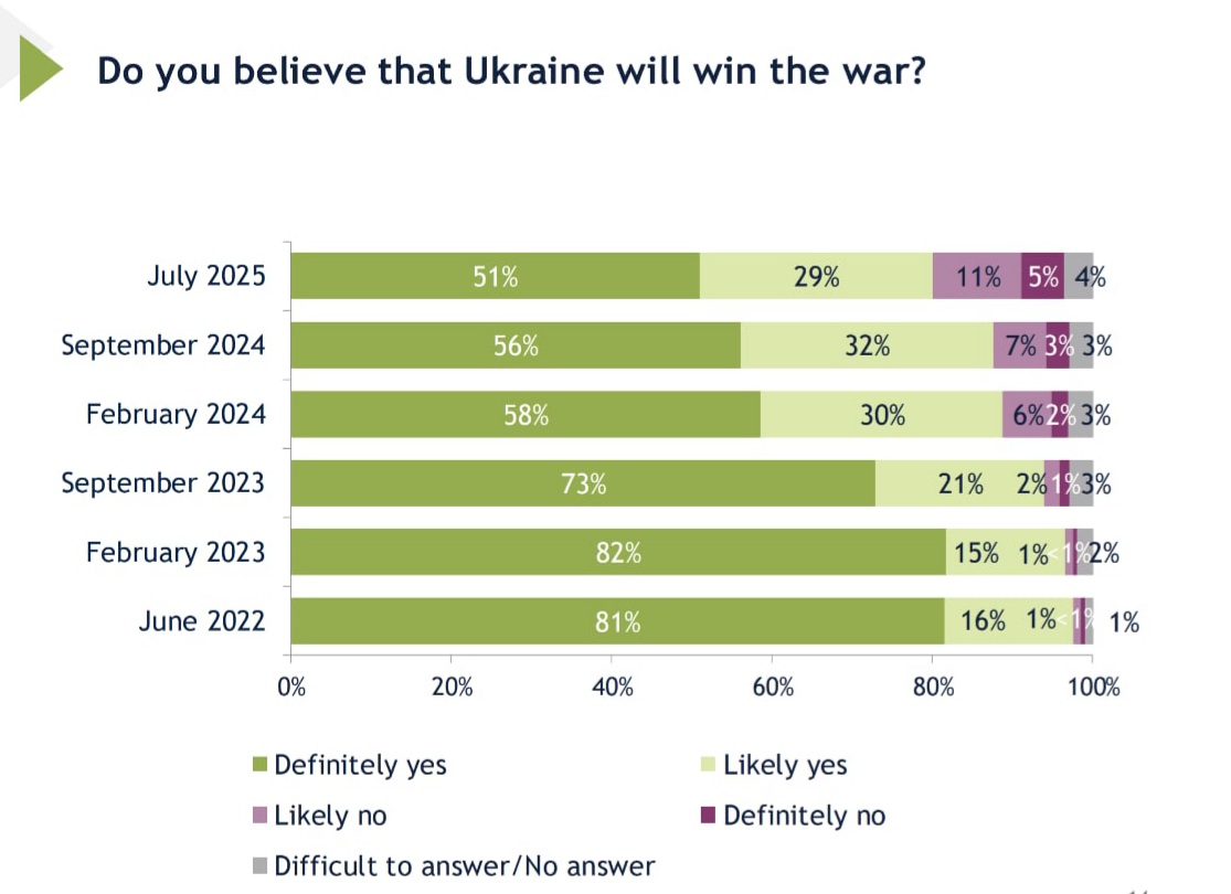Згідно з даними опитування соціологічної групи "Рейтинг", проведеного 30 липня - 6 серпня 2025 року, 55% українців переконані, що перемоги ЗСУ нині є головним фактором єдності. У соцдослідженні також вказано, що 75% громадян підтримують вступ України до Європейського Союзу та 71% опитаних — до НАТО.